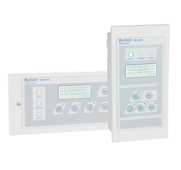 The universal remote alarm indicator and test combination MK2430 is designed for visual and audible indication of alarm messages from Bender systems such as EDS, RCMS and MEDICS. In MEDICS® monitoring systems, the MK800 meets the requirements of IEC 60364-7-710 and DIN VDE 0100-710:2002-11 in respect of test functions for IT system monitoring and alarms from changeover modules. The IT system monitoring equipment can be tested using the programmable test button.